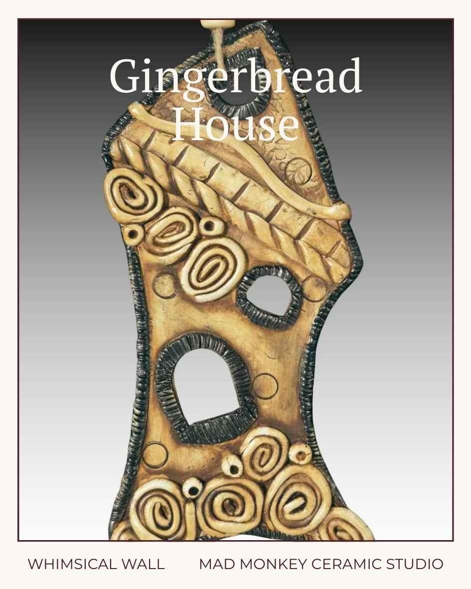 Transform any space into a cozy, enchanting sanctuary with our Handmade Ceramic Fantasy House Wall Hanging. This unique piece is a stunning blend of craftsmanship and creativity, featuring flowing spiral designs, richly textured roof patterns, and warm amber glazes with subtle dark accents. Its handcrafted stoneware design ensures every piece is one-of-a-kind! Sculpture is 9 inches tall and 4 inches wide